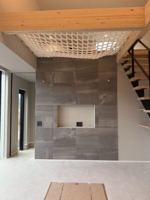 吹き抜け部分にはハンモックネットを張り、家族の気配を感じながらくつろげる“空に浮かぶくつろぎスペース”