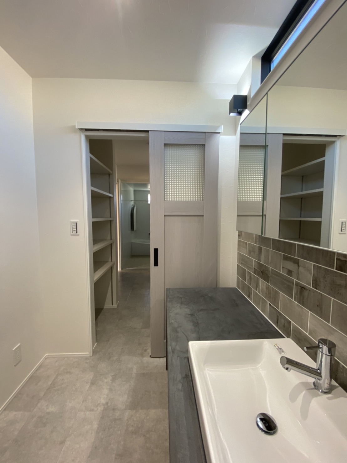 シックな色合いで高級感のある造作洗面台はモールテックスを使用。