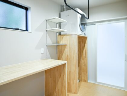 乾太くんと造作カウンターで、洗う・干す・たたむがここだけで完結。