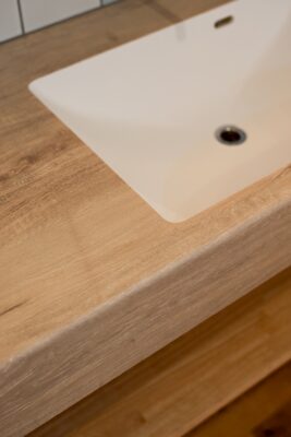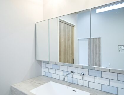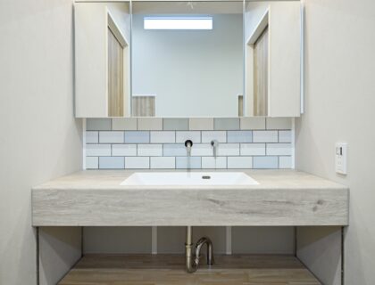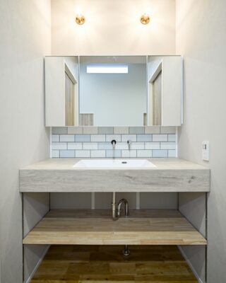 木の質感とタイルを組み合わせた、温かみのある造作洗面。