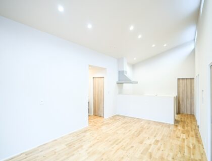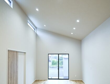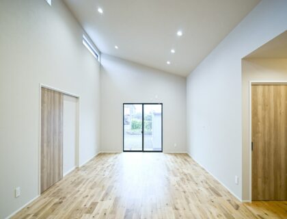 勾配天井が生み出すゆとりある高さと、廊下のないスムーズな動線がつくる開放的な18帖のリビング。