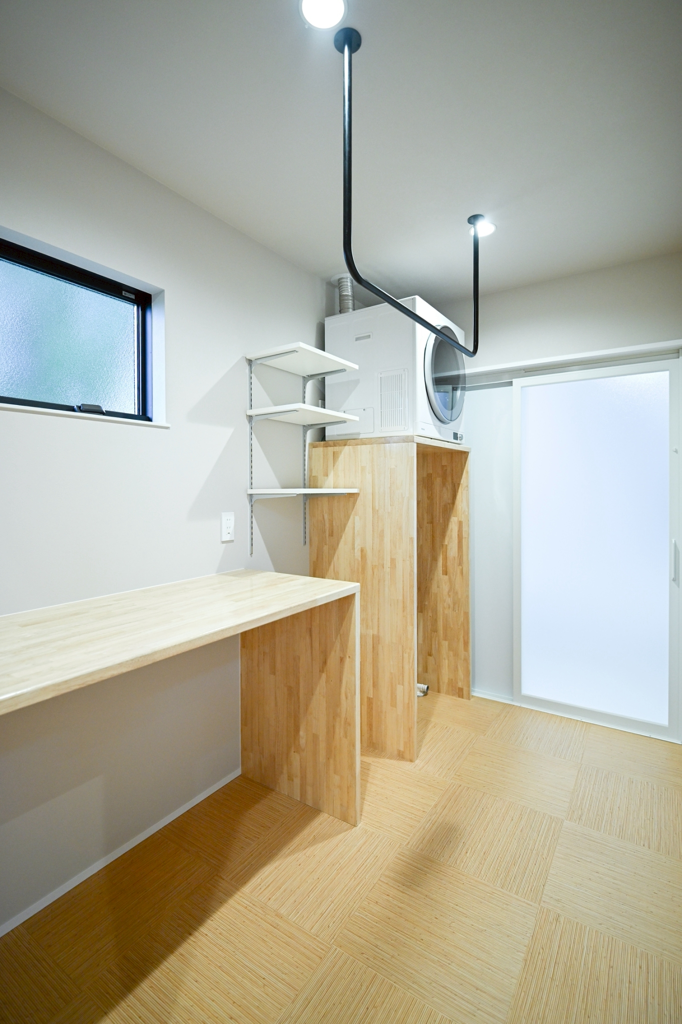 乾太くんと造作カウンターで、洗う・干す・たたむがここだけで完結。