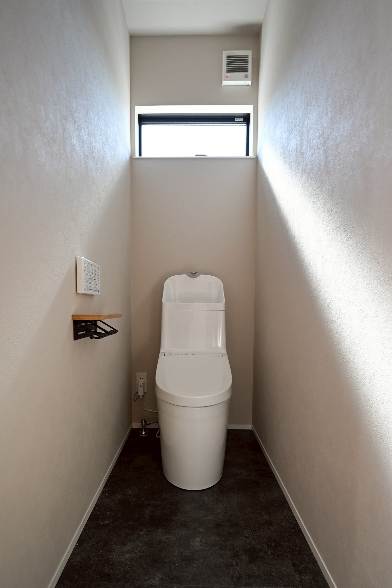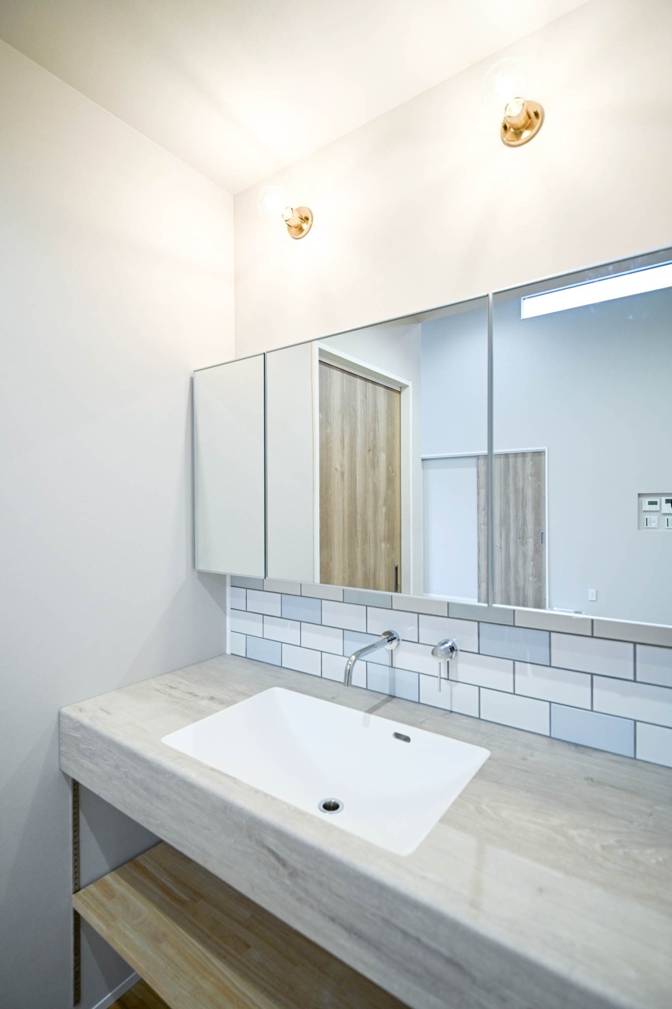 下部にはオープン棚を設け、タオルやストック品をスッキリ収納できるようにしました。