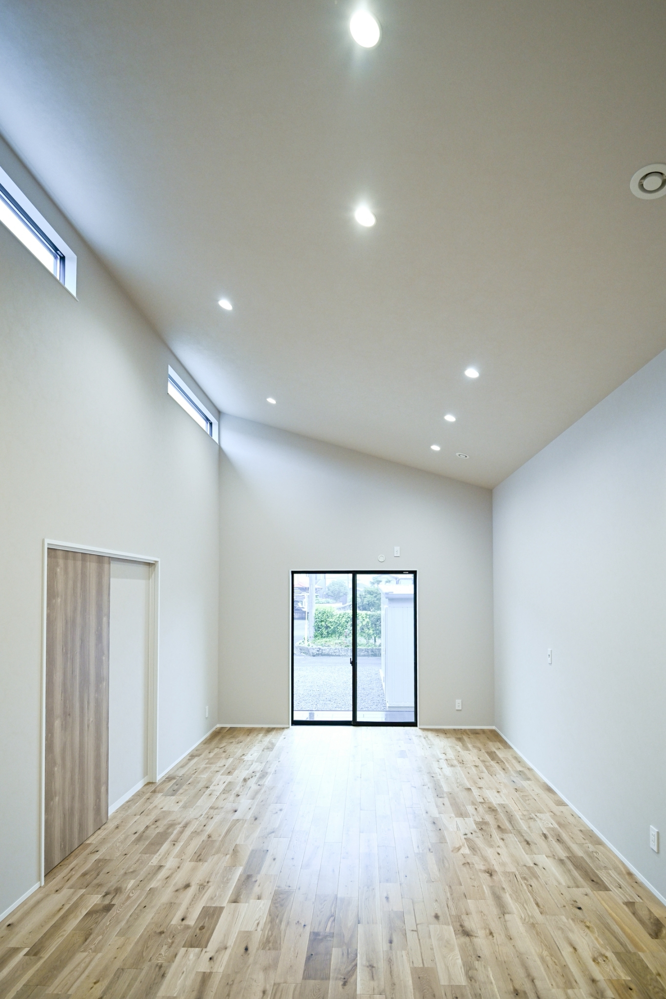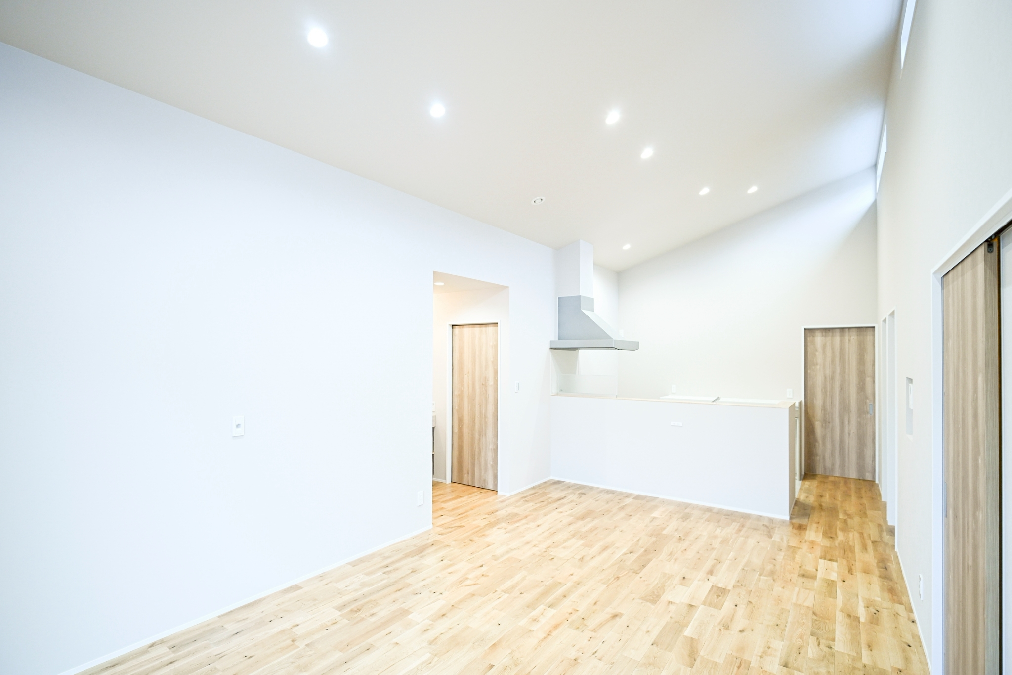 勾配天井が生み出すゆとりある高さと、廊下のないスムーズな動線がつくる開放的な18帖のリビング。